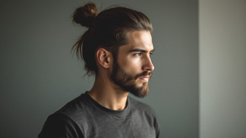 El Man Bun, o moño masculino, ha trascendido la etiqueta de tendencia para consolidarse como un estilo de cortes de pelo atemporal y lleno de personalidad para hombres con cabello largo. Consiste en recoger el cabello en un moño, que puede ubicarse en la coronilla o en la nuca. Su versatilidad es una de sus mayores fortalezas, ya que se adapta a diferentes longitudes y texturas de cabello, y puede combinarse con los lados rapados (undercut) o con una barba bien cuidada para un look más robusto.