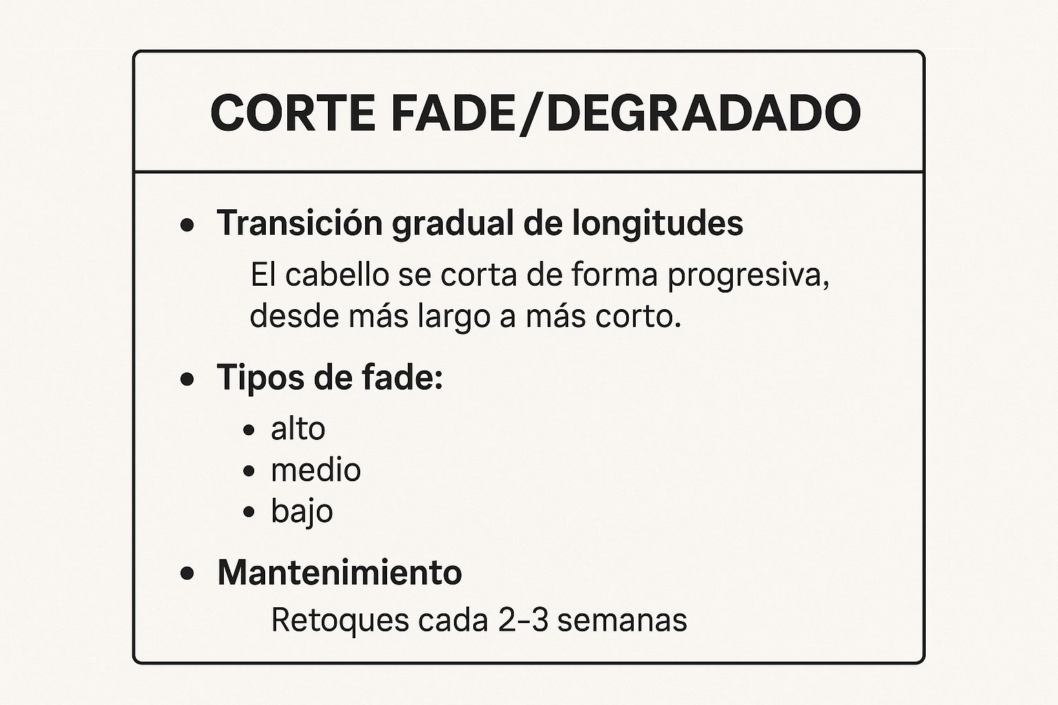 Corte Fade/Degradado | Moderada - requiere experiencia profesional | Alta - cortes frecuentes y productos ligeros | Transición suave y profesional | Todo tipo de rostro, especialmente ovalado y cuadrado | Versátil, aspecto limpio, fácil de mantener |
