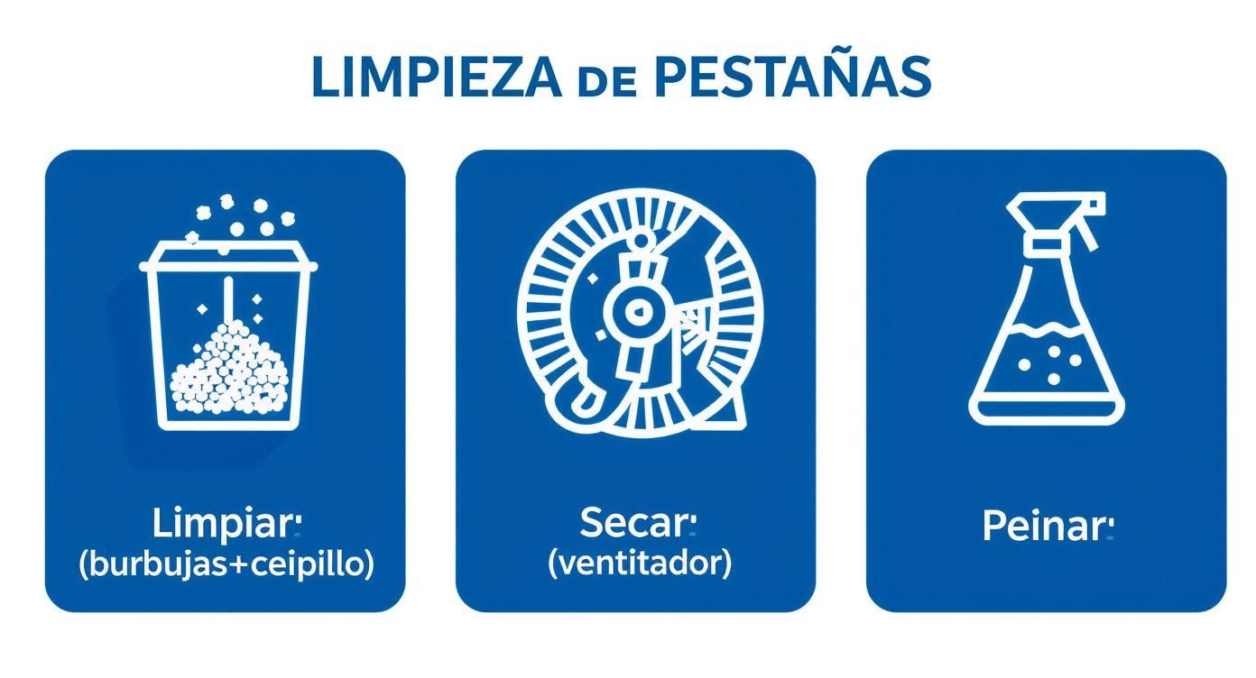 Para que no te quede ninguna duda, esta infografía te muestra en 3 sencillos pasos cómo limpiar y peinar tus extensiones correctamente sin dañarlas en absoluto. Es el proceso exacto que recomiendo a mis clientas.