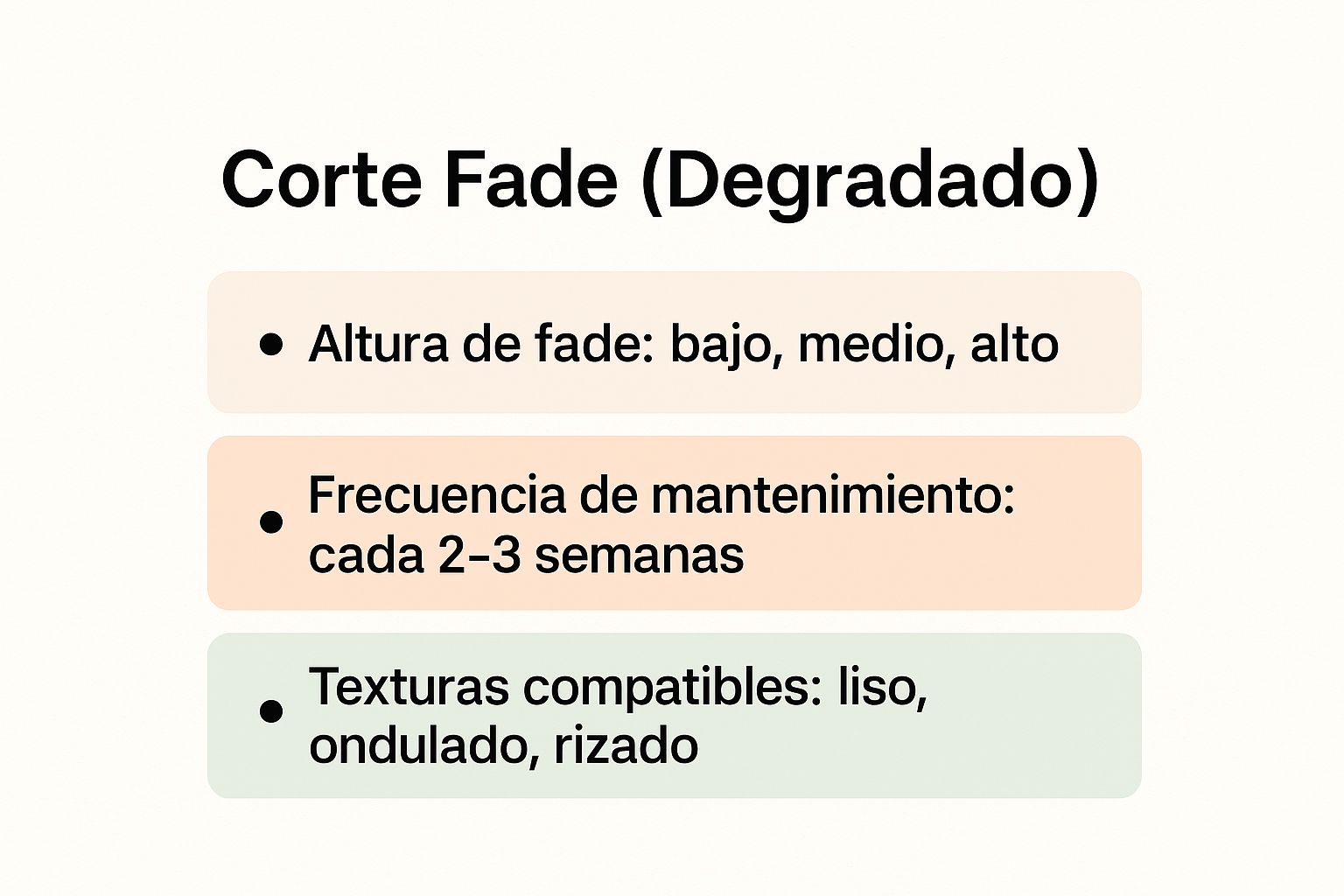 Corte Fade (Degradado) | Moderada (requiere profesional cada 2-3 semanas) | Barbero o máquina de corte, productos moldeadores | Aspecto limpio, moderno y profesional | Hombres de todas las edades que buscan estilo versátil y bajo mantenimiento diario | Versátil, acentúa rostro, combina con barbas |